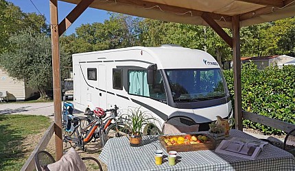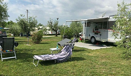 Circa 120/140 M2 con acqua e scarico, corrente 16 Amp., gazebo con tavolo / sedie e barbecue in dotazione.