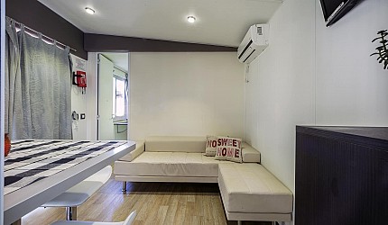 Unità abitative ideali per cinque persone, ampio spazio interno, una camera matrimoniale e una camera con tre letti singoli, zona soggiorno con divano, angolo cottura, lavastoviglie, TV, bagno con doccia (con cromoterapia) /wc, aria condizionata/riscaldamento e terrazza coperta con mobili da giardino.