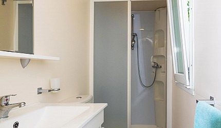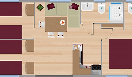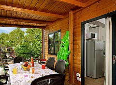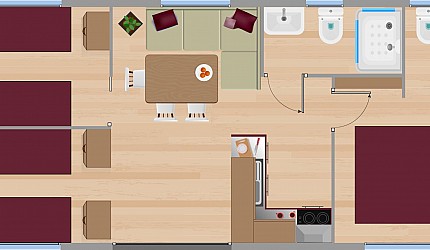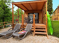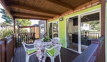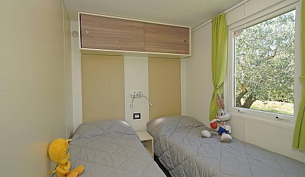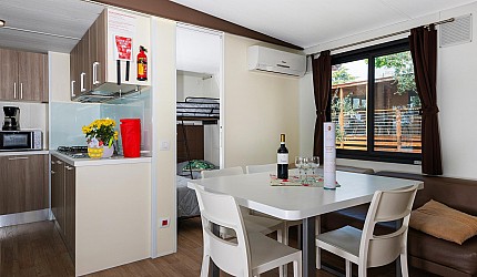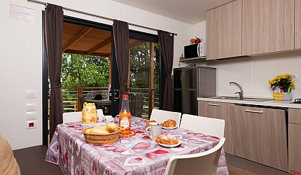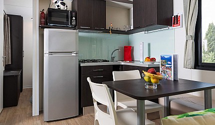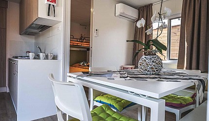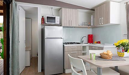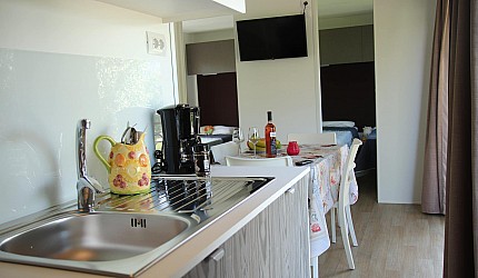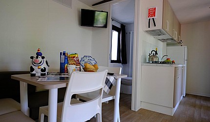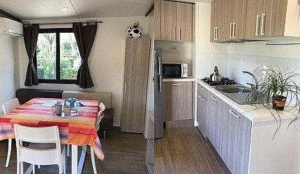 Unità abitative per 6 persone sono posizionate nella zona vicina alla piscina, ideali per 6 persone, 3 camere da letto, zona soggiorno con angolo cottura, lavastoviglie, microonde, TV, bagno con doccia/wc, aria condizionata e riscaldamento, terrazza coperta con mobili da giardino.