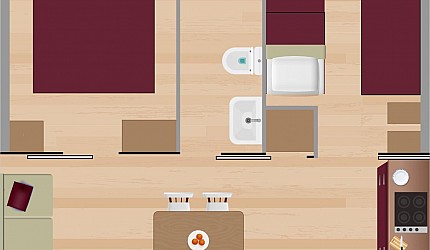 Sistemazione ideale per 5 persone, con camera matrimoniale e camera con tre letti singoli, zona soggiorno con angolo cottura, bagno con doccia/wc, aria condizionata e riscaldamento, terrazza coperta.