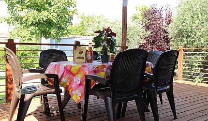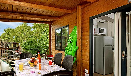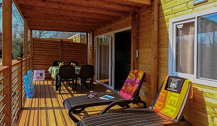 Unità abitative per 6 persone sono posizionate nella zona vicina alla piscina, ideali per 6 persone, 3 camere da letto, zona soggiorno, TV, angolo cottura, microonde, bagno con doccia/wc, aria condizionata e riscaldamento, terrazza coperta con mobili da giardino.