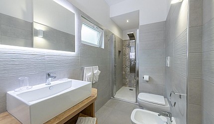 Bagno con box doccia. Patio esterno attrezzato con divanetti e tavolo e sedie per pranzare fuori.