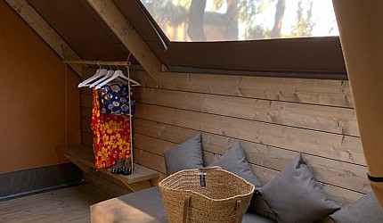 Per l'estate 2020 siamo felici di presentare ancora una novità: la nostra Tiny Tent, una tenda dalla struttura audace e accattivante. Forma a Pentagono su due piani, cucina soggiorno e camera per i ragazzi a piano terra. Piano superiore caratterizzato da una spaziosa camera con due pareti finestrate che si affacciano sul verde del nostro Campeggio.La camera oltre al comodo letto matrimoniale si presenta con un delizioso angolo relax, per le tue letture serali alla stessa altezza degli alberi per farti sentire in Paradiso.