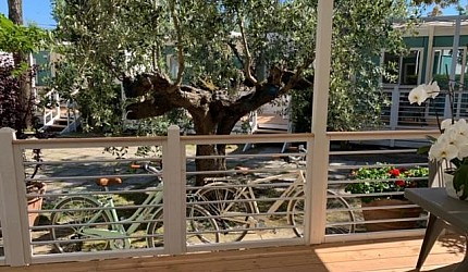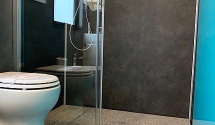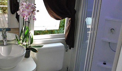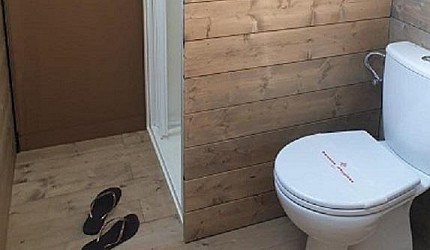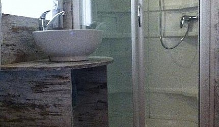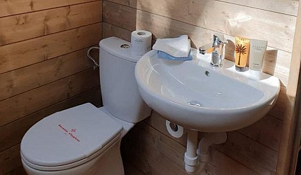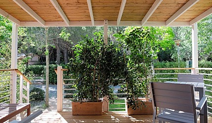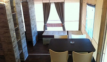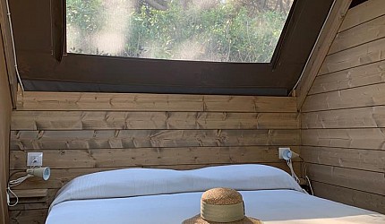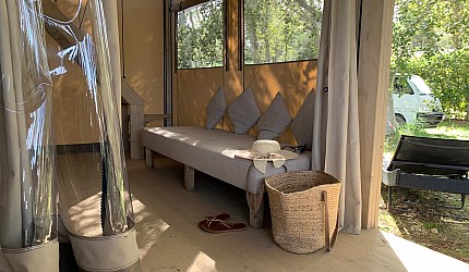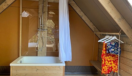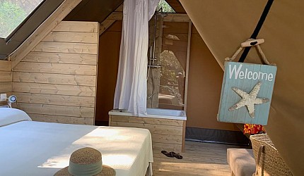 La nuova arrivata, volutamente semplice per richiamare alla mente la vera vacanza in tenda, ma con eleganti particolari tutti in legno, dal pavimento alla pareti alla vasca da bagno rivestita in legno!