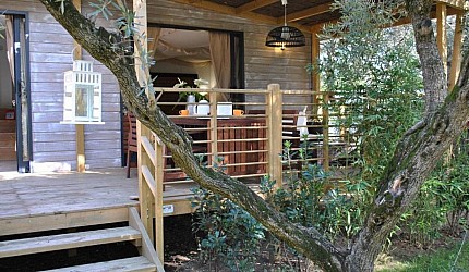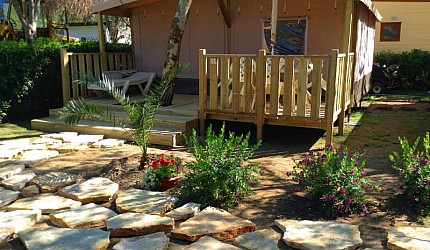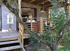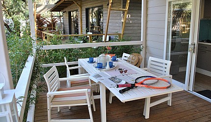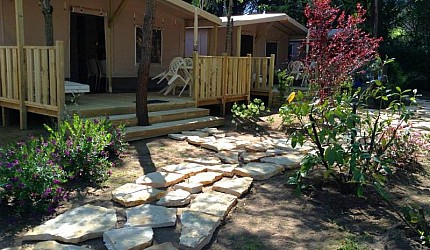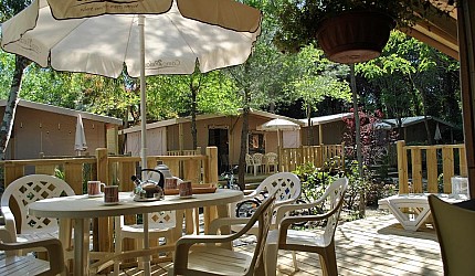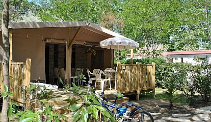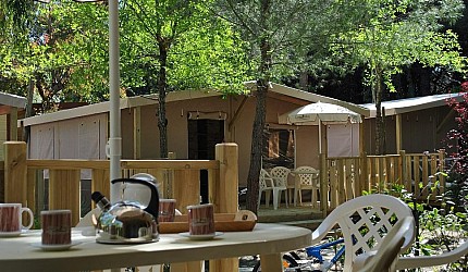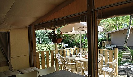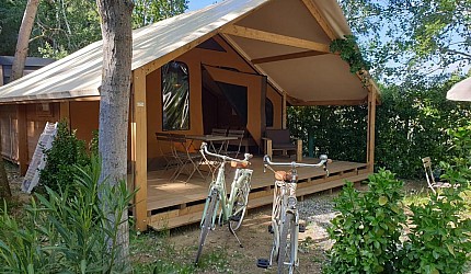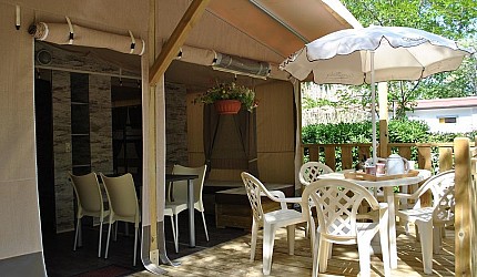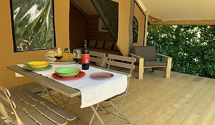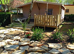 La vacanza glamour in Tenda al Molino a Fuoco Camping Village per tutta la famiglia. Questa versione offre tutti i comfort per coppie con bambini in unatmosfera country. 3 locali, bagno, veranda e giardino.
