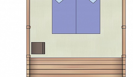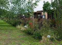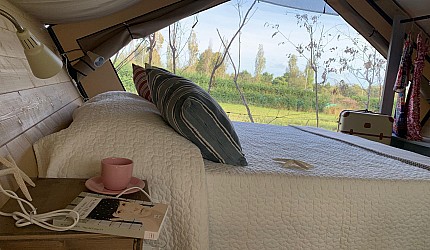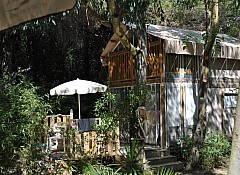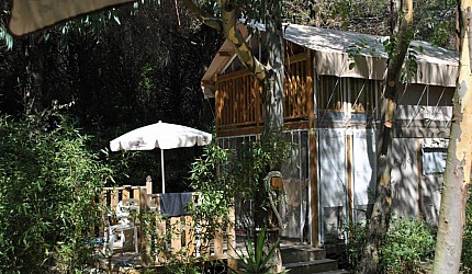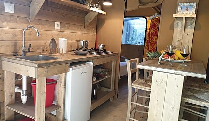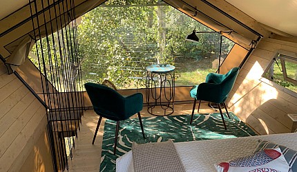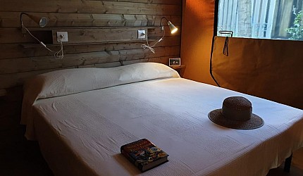 Una tenda su un unico piano rialzato, composto unicamente da una comoda camera da letto, arredata in modo semplice e funzionale, in pieno stile delle tende avventura. Le 2 grandi finestre che si aprono sul tetto e la veranda davanti alla camera donano luminosità e continuità di spazio con il giardino. Alloggio dotato di mini-bar.