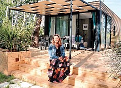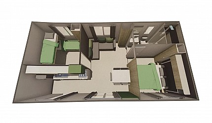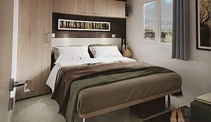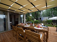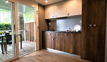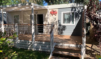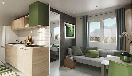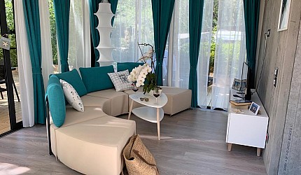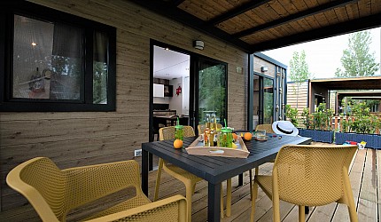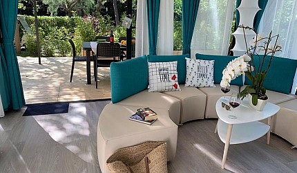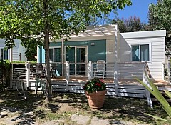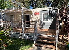 Questo nuovo modello di Casa Mobile si caratterizza per la sua linea moderna, e la continuità architettonica con la grande veranda. All'interno gli spazi sono studiati per offrire comfort e gli arredi moderni si presentano con colori tenui che doneranno ai nostri ospiti il giusto relax in continuo contatto con il giardino esterno grazie anche alle ampie vetrate scorrevoli.