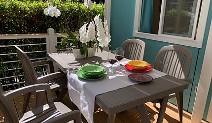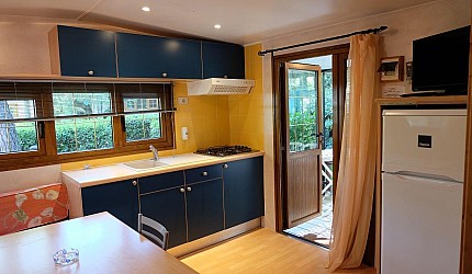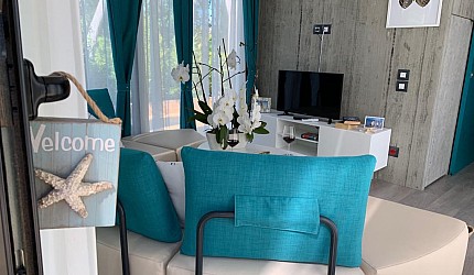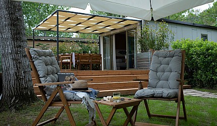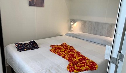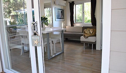 Ampio bungalow bilocale, di cui uno arredato con letto matrimoniale e l'altro con divano trasformabile. Guardaroba, angolo pranzo,...
