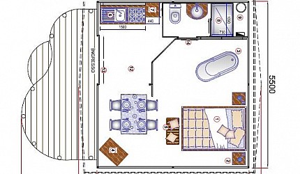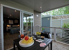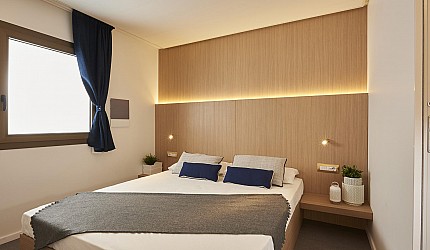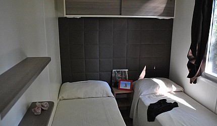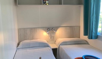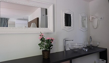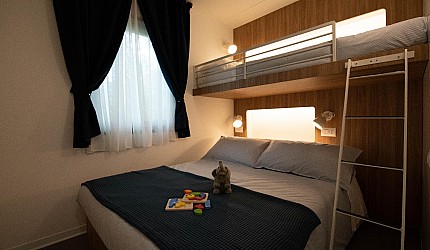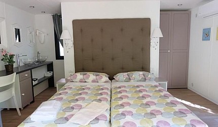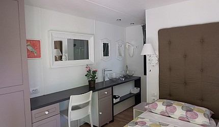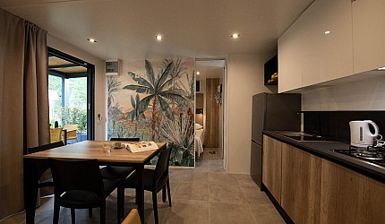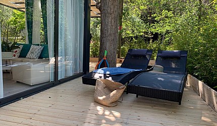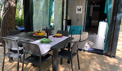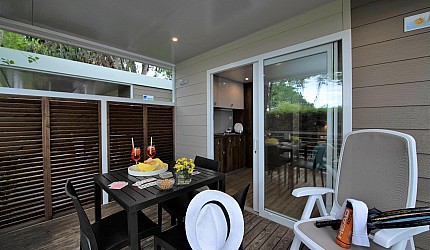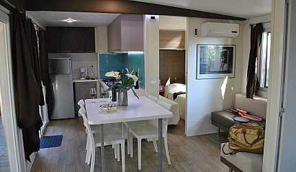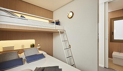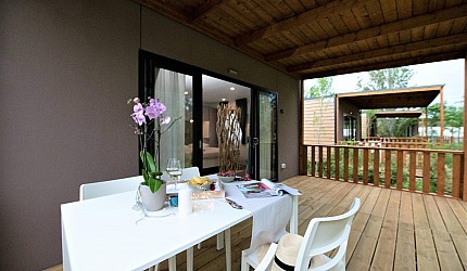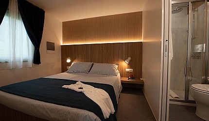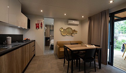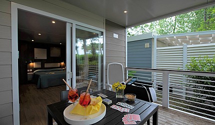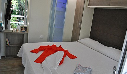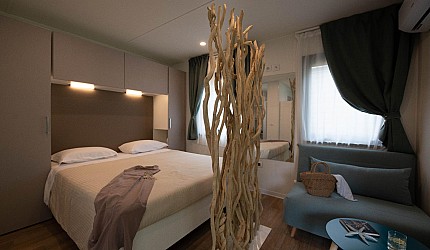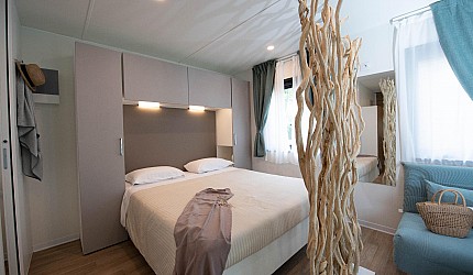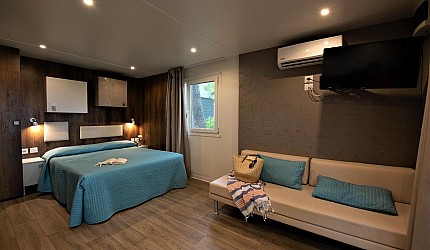 La vita in campeggio si trasforma in unesperienza unica soggiornando in una vera e propria suite di albergo, luminosa e accogliente grazie ad un arredo curato e raffinato. I servizi inclusi nel soggiorno saranno il vero valore aggiunto della vostra vacanza. Alloggio composto da camera matrimoniale, bagno completo, frigo-bar. Compreso nel prezzo trattamento di mezza pensione (colazione + cena).