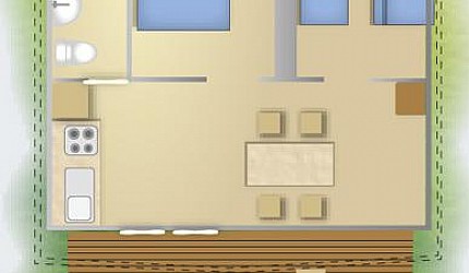 Ampio bungalow trilocale, composto da camera con letto matrimoniale e camera con due letti singoli; il terzo locale è adibito a zona pranzo con cucina in acciaio inox, frigorifero, stoviglie. Servizi igienici con doccia calda. Veranda esterna coperta. Inclusa biancheria da letto. E' corredato di TV color satellitare e aria condizionata.