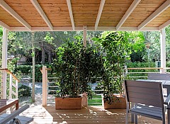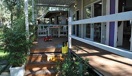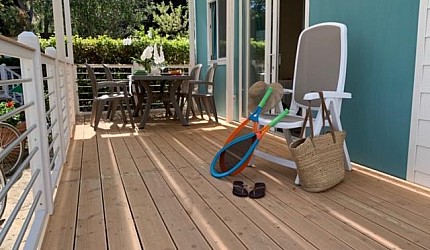 Dotate di ogni comfort: armadi, bagno con doccia, lavabo e WC. Camera con tre letti per i vostri bambini e camera matrimoniale. Soggiorno con angolo cottura adiacente alla veranda in legno esterna, luogo ideale per pranzare, cenare e rilassarsi.