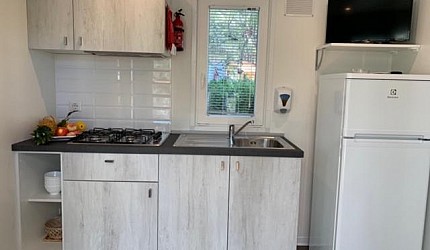 Ampio bungalow bilocale, di cui uno arredato con letto matrimoniale e l'altro con divano trasformabile. Guardaroba, angolo pranzo, cucina in acciaio inox, frigorifero, stoviglie, posateria, TV color satellitare, aria condizionata. Servizi igienici con doccia calda. Veranda esterna coperta. Incluso biancheria da letto.