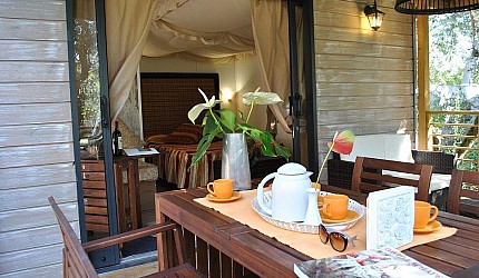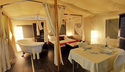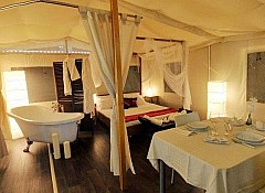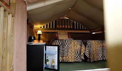 La nostra ormai famosa Lodge Tent si trasforma, aprendo tutti gli spazi interni per accogliere la coppia in un atmosfera glamour. Il letto a baldacchino con zanzariera e la vasca da bagno regaleranno momenti di vero relax e privacy. A richiesta, può essere abbinata ad una MINI LODGE TENT in giardino, per ospitare il resto della famiglia. Alloggio composto da camera matrimoniale, cucina e mini-bar.