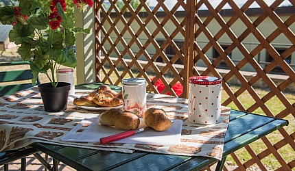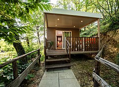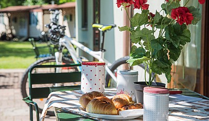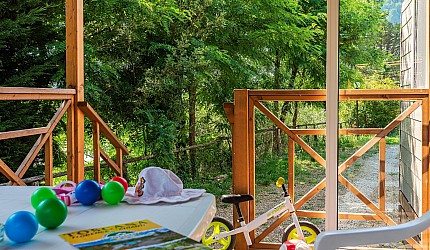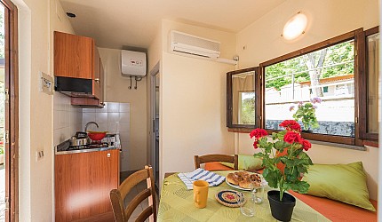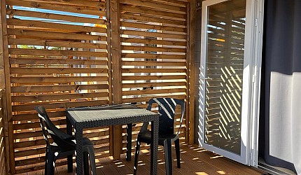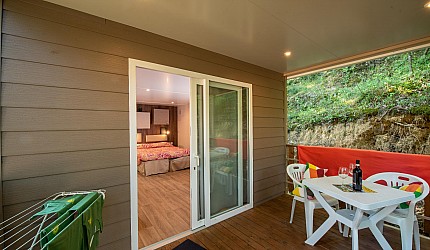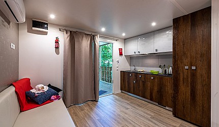 I maxi caravan Studio, sono composti da 1 camera da letto matrimoniale e 1 bagno con doccia, un piccolo soggiorno con angolo cottura e una veranda esterna con tavolo e sedie.
