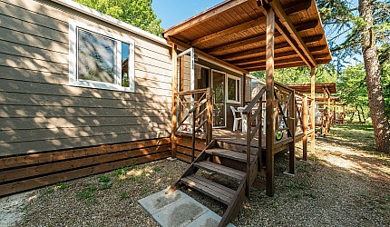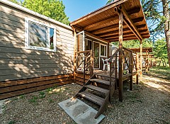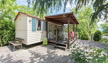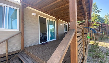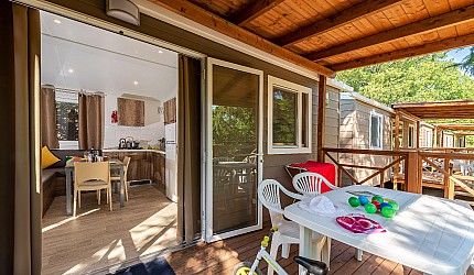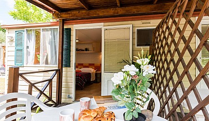 Mobile home per 4 persone composta da 1 camera matrimoniale, una camera con 2 letti singoli, soggiorno con angolo cottura, bagno con doccia, veranda esterna con tavolo e sedie.