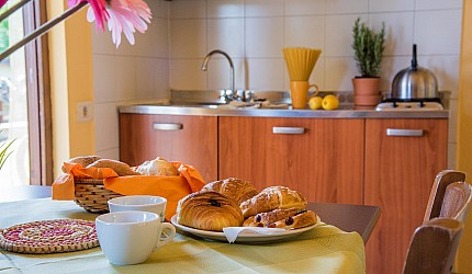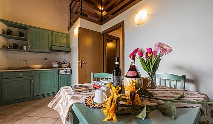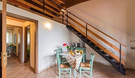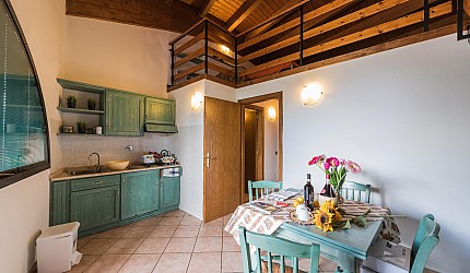 L'appartamento è composto da 1 camera con letto matrimoniale, bagno con doccia, cucina completa e loggiato esterno attrezzato con tavolo e sedie.
