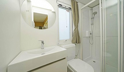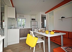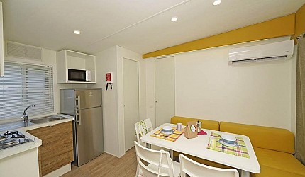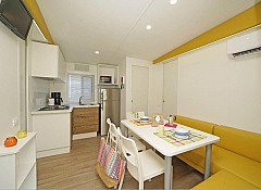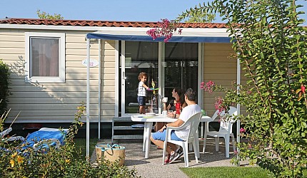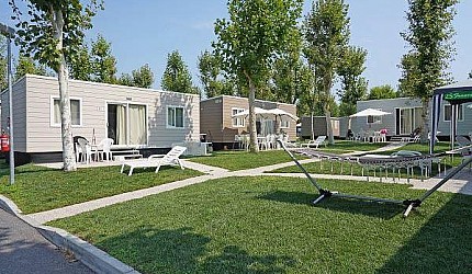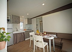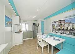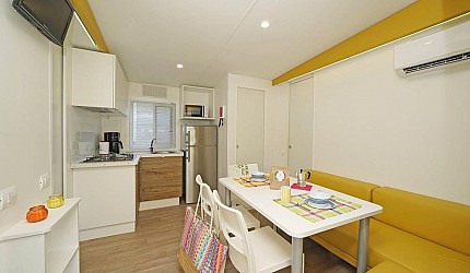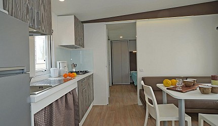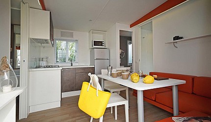 Casa mobile ideale per 4 persone, (8 mt. x 4 mt.). Un nuovo concetto di casa mobile per una vacanza in famiglia: stile moderno open space. Un letto matrimoniale, due letti singoli, un bagno con doccia e cucina attrezzata con due piastre ad induzione. Frigorifero, freezer, microonde, cassaforte, televisione e aria condizionata. Stoviglieria, cuscini e coperte. All'esterno, terrazza con tendalino, tavolo, sedie, due sdraio, e giardino con barbecue.