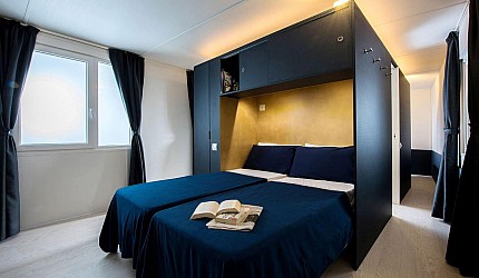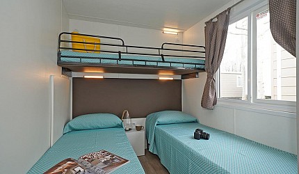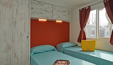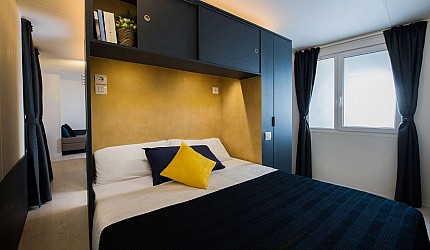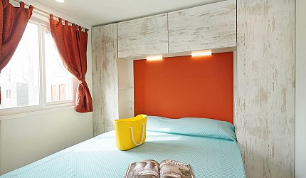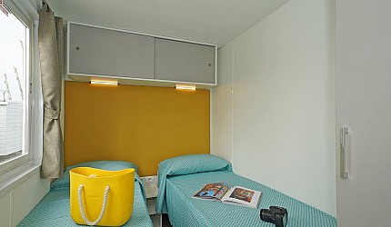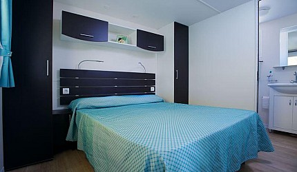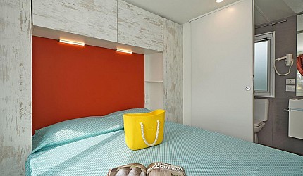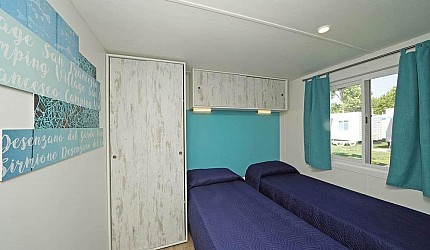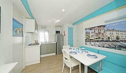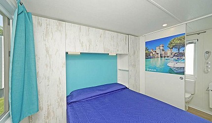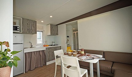 Ideale per 4/5 persone, (7.60 mt. x 4 mt.) con ampia e luminosa porta d'ingresso, composta da due camere da letto, una matrimoniale e una a due letti, entrambe con bagno completo con asciugacapelli; dinette con letto estraibile, frigorifero, freezer, microonde, cassaforte e aria condizionata, terrazza con tendalino e giardino, sedie, due sdraio, barbecue e televisione. Sono dotate di stoviglieria, cuscini e coperte. Arredo interno con colori moderni.