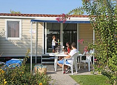 Casa mobile ideale per 4/5 persone, (8 mt. x 4 mt.) composta da due camere da letto, una matrimoniale e una a due letti, entrambe con bagno completo con asciugacapelli; dinette con divano letto, frigorifero, freezer, microonde, cassaforte e aria condizionata, televisione. Sono dotate di tutta la stoviglieria, cuscini e coperte. All'esterno, terrazza con tendalino, tavolo, sedie, due sdraio, e giardino con barbecue.