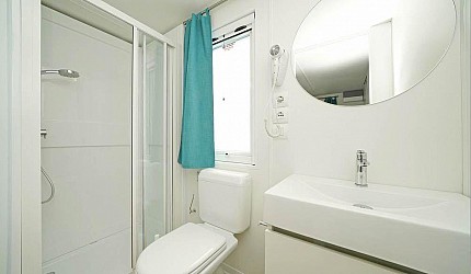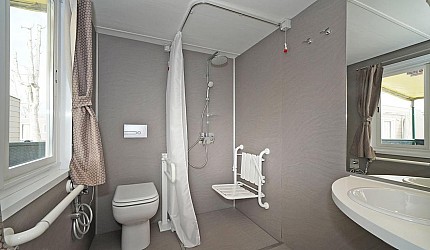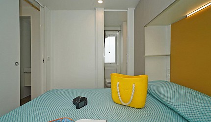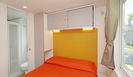 Casa Mobile Ideale per 5/6 persone, (8.3 mt. x 4 mt.) composta da due camere da letto: una matrimoniale accessibile con piccolo bagno completo e una a tre letti di cui un lettino adatto ad un bambino, un secondo bagno completo accessibile con asciugacapelli; dinette con divano letto, frigorifero, freezer, microonde, cassaforte e aria condizionata e televisione. Sono dotate di tutta la stoviglieria, cuscini e coperte. All'esterno, terrazza accessibile con tendalino, tavolo, sedie, due sdraio, e giardino con barbecue.Queste case mobili sono particolarmente studiate per venire incontro ai bisogni di maggior confort di persone con disabilità e problemi motori.