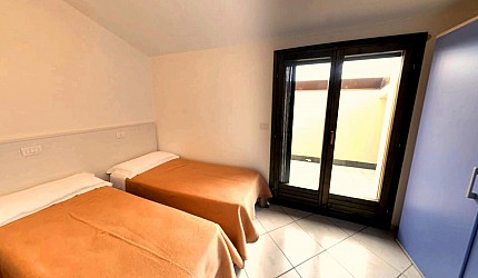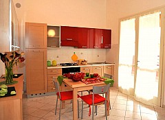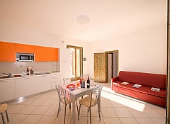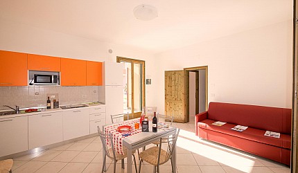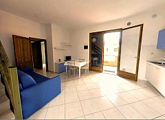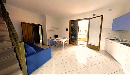 Luminoso trilocale al primo piano composto da ingresso con soggiorno e angolo cottura, divano letto, due camere da letto e bagno. Provvisto di ampia terrazza da cui godere la tranquillità che circonda il residence.
