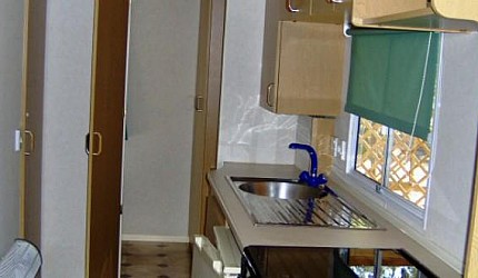 Küchenecke mit Kühlschrank und Gasherd ausgestattet. Badezimmer mit Dusche und WC.