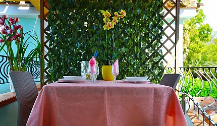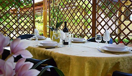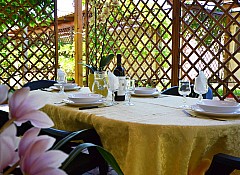 Küchenecke in der äuβeren Veranda mit Kühlschrank, Gasherd. Badezimmer mit Dusche, WC und Bidet