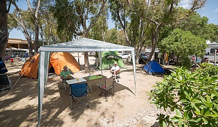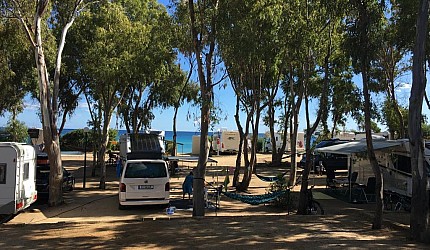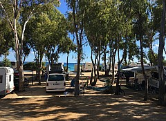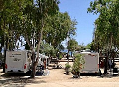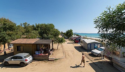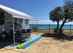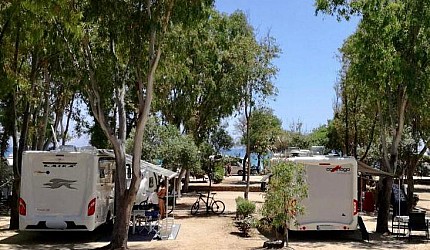 L'ensemble village de vacances camping s'étend parallèlement à la plage, ce type d'emplacements est donc à quelques mètres des accès à la mer et bénéficie pour bonne part de vues panoramiques. Les grands eucalyptus et les mimosas créent une ombre diffuse.