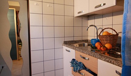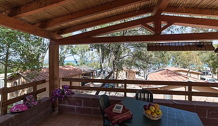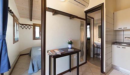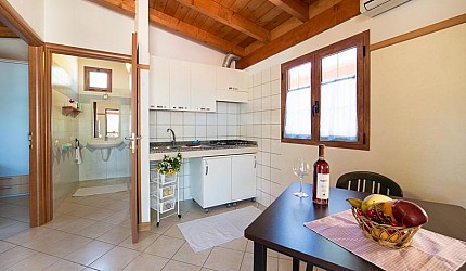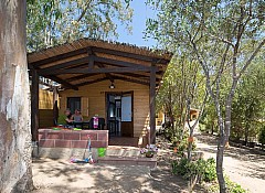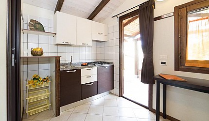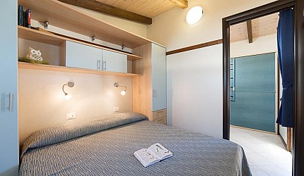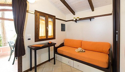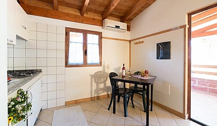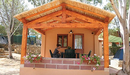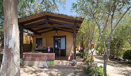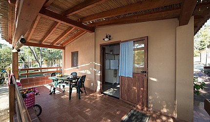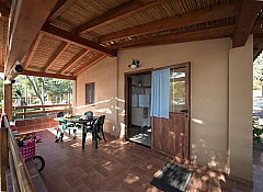 Les bungalows pour 4 personnes (environ 30 mc.) sont aussi accessibles aux handicapés moteurs. Le Bungalow est composé par une chambre matrimoniale, une chambre avec deux lits, une pièce salle de séjour, coin cuisine équipée et toilette (wc, lavabo, bidet et douche). Les bungalows sont dotés de four gaz, réfrigérateur, évier, armoire avec la vaisselle (marmites, plats, verres et couverts etc.). À l'extérieur de bungalows une terrasse couverte de 10/12 m² environ offre la possibilité de manger agréablement (table et chaises en dotation) et de se détendre à l'ombre.