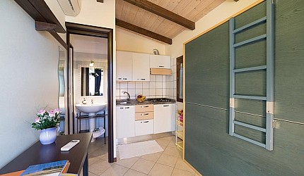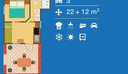 Pour 3 personnes (Environ 22 m². + terrasse couverte). Il se compose d'une chambre avec lit double, un salon avec un confortable canapé / lit confortable, un coin cuisine équipé et une salle de bain (wc, lavabo, bidet et douche). Tous les lits sont de taille standard (80 x 190 cm et 160 x 190 cm le lit double)