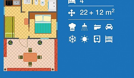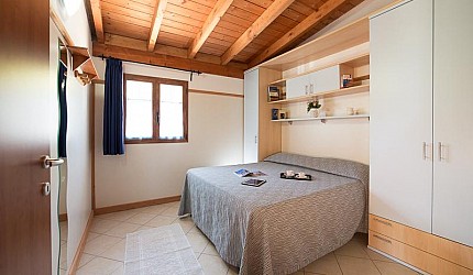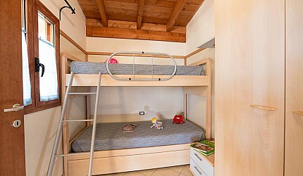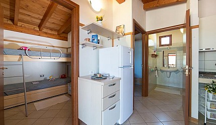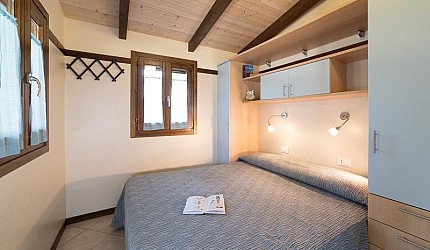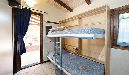 Les chambres ont des lits de taille standard (80×190 cm ou 160 x 190 m). Le lit double est légèrement plus haut La petite chambre a un lit superposé, l'espace permet de se déplacer confortablement dans la chambre principale et dans la petite chambre. Dans ce type de bungalow vous pouvez ajouter un lit pour la 5ème personne.
