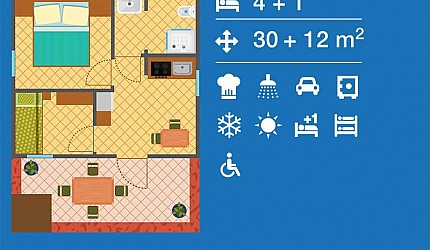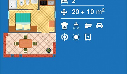 Pour 2 personnes (Environ 20 m² + terrasse couverte). Il se compose d'un salon avec lit double, un coin cuisine équipé et d'une salle de bain (wc, lavabo, bidet et douche). Le lit double est de taille standard (160 x 190 cm.)