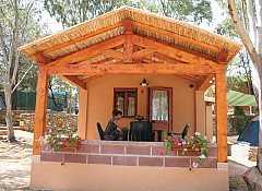 Pour 2 personnes (Environ 20 m² + terrasse couverte). Il se compose dun salon avec lit double, un coin cuisine équipé et d'une salle de bain (wc, lavabo, bidet et douche). Le lit double est de taille standard (160 x 190 cm.)