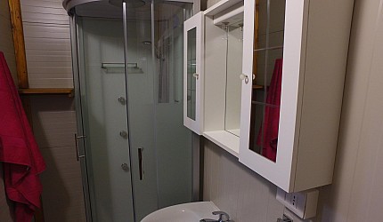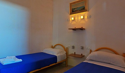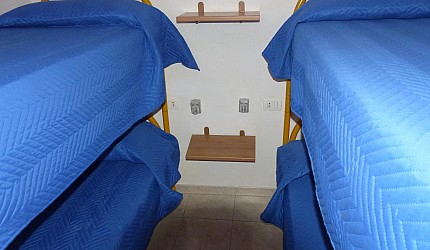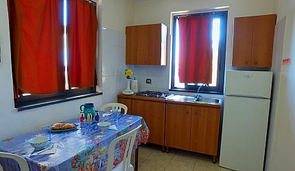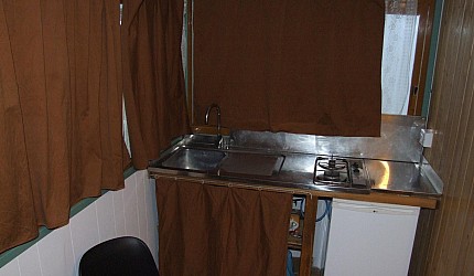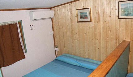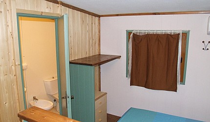 Ambiente único con un tabique de madera que divide la zona de noche, una cama matrimonial u/o 2 individuales de la zono de día con cocinita, mesa, sillas, vajillas, nevera y una cama individual. Cuarto de baño con lavabo, bidé y ducha con agua caliente.