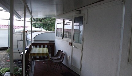 Casa móvil compuesta de sala de estar (cocina, nevera, mesa, sillas, platos); àrea con dos ambientes diferentes (1 cama doble + 2 camas individuales) un sofà cama en la sala de estar; cuarto de baño (WC+ lavabo y ducha con agua caliente); una pequeñ terraza con meza sillas y un banquillo.